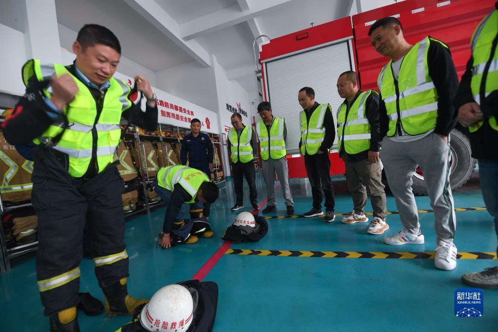 5月10日,在昌化消防中队,昌化镇应急救援队员现场学习灭火救援服的快速穿戴。