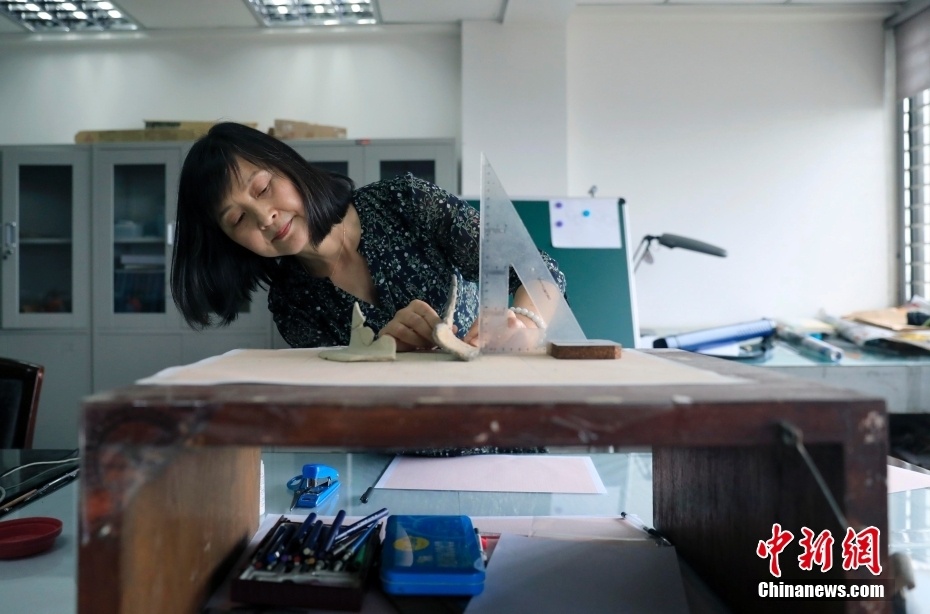 5月11日,在成都文物考古研究院考古绘图室内,考古绘图师李福秀在绘制一件文物。中新社记者 王磊 摄