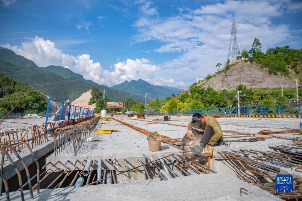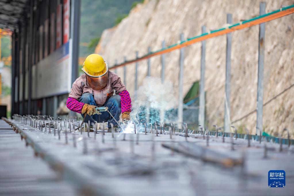 5月11日,在巫镇高速公路一标段施工现场,施工人员在焊接面板钢筋。