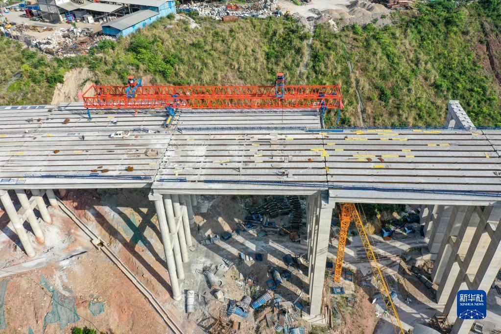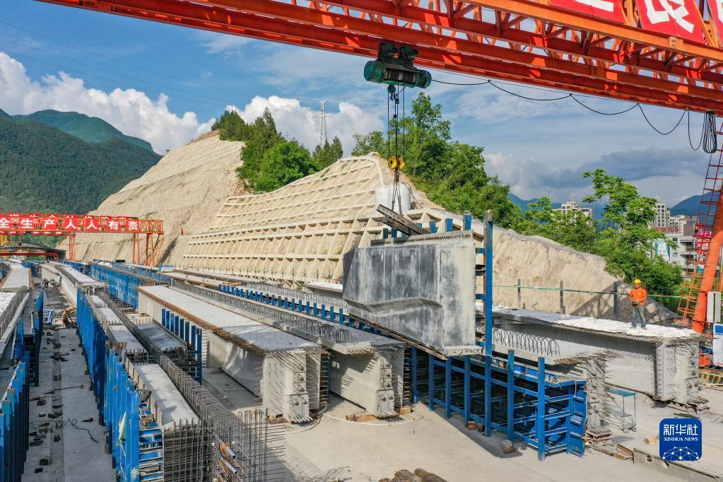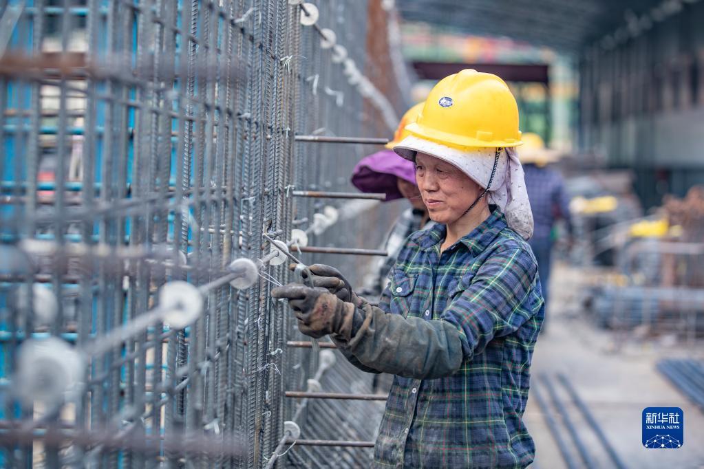 5月11日,在巫镇高速公路一标段施工现场,施工人员在绑扎预制T型梁骨架钢筋。