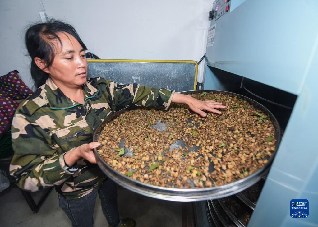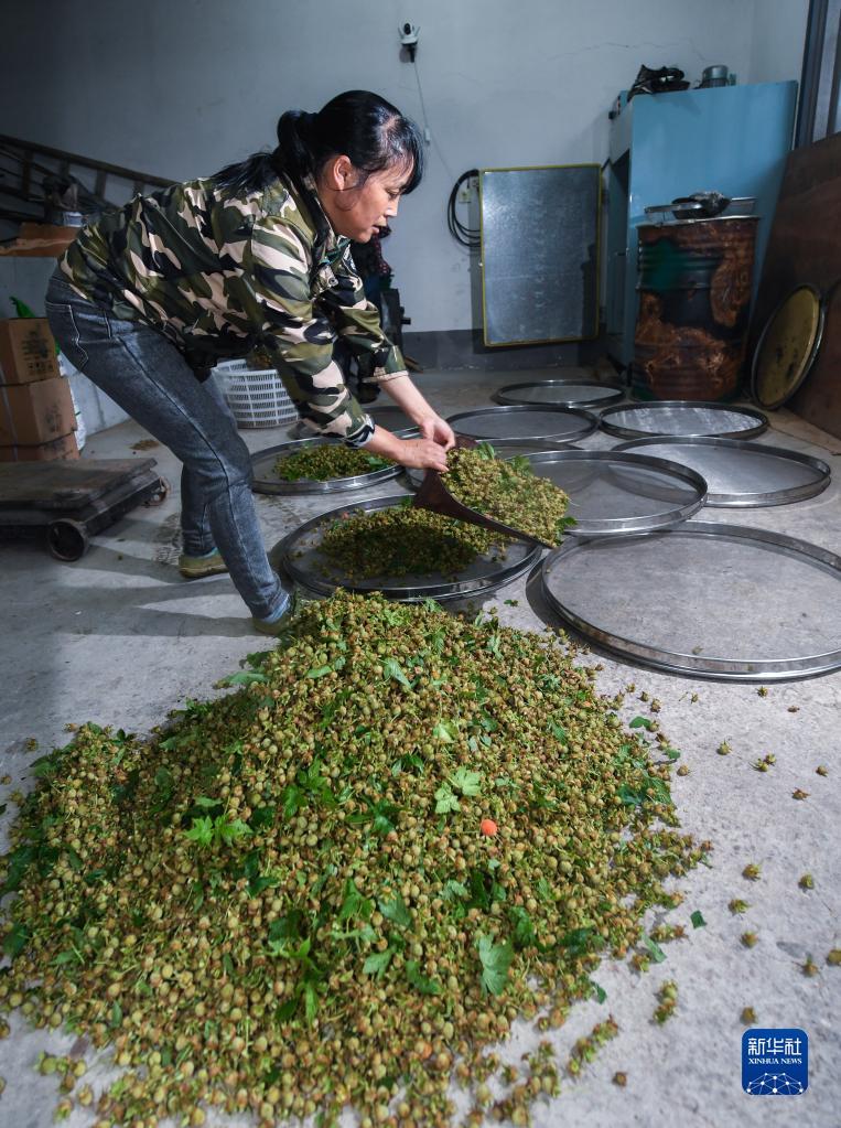 5月12日,临岐镇夏中村的村民姚苹香在查看烘干后的覆盆子青果。新华社记者 徐昱 摄