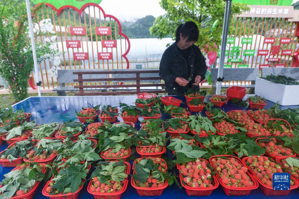 5月13日,种植户在临岐镇临岐村的覆盆子采摘园摆放用于销售的覆盆子红果。新华社记者 徐昱 摄