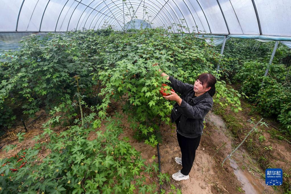 5月13日,种植户在临岐镇临岐村覆盆子采摘园的大棚内采摘成熟的覆盆子红果。新华社记者 徐昱 摄