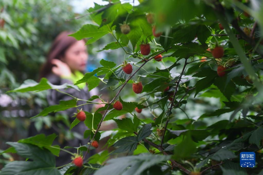 5月13日,游客在临岐镇临岐村覆盆子采摘园的大棚内采摘成熟的覆盆子红果。采摘园的覆盆子主要供游客采摘,发展乡村旅游。新华社记者 徐昱 摄