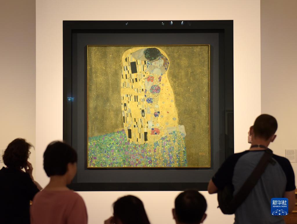 5月12日,游客在奥地利维也纳美景宫博物馆观看画家古斯塔夫·克利姆特的作品《吻》。
