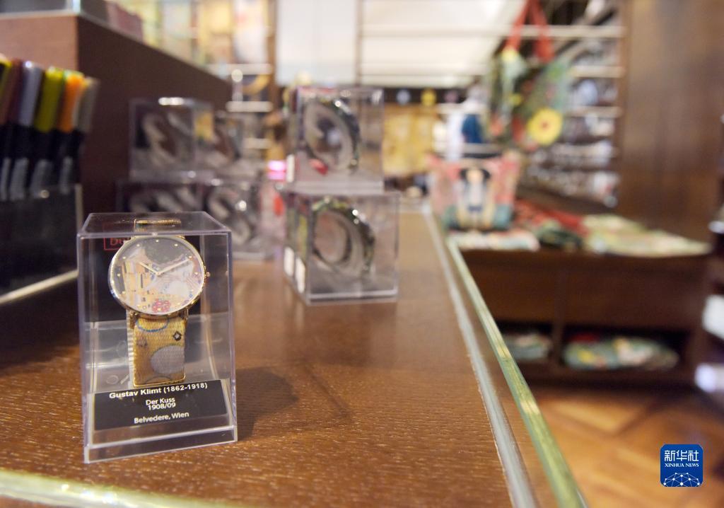这是5月12日在奥地利维也纳美景宫博物馆拍摄的印有《吻》画面的手表。