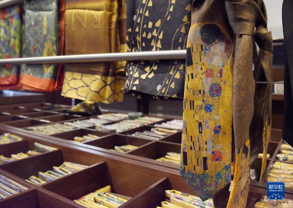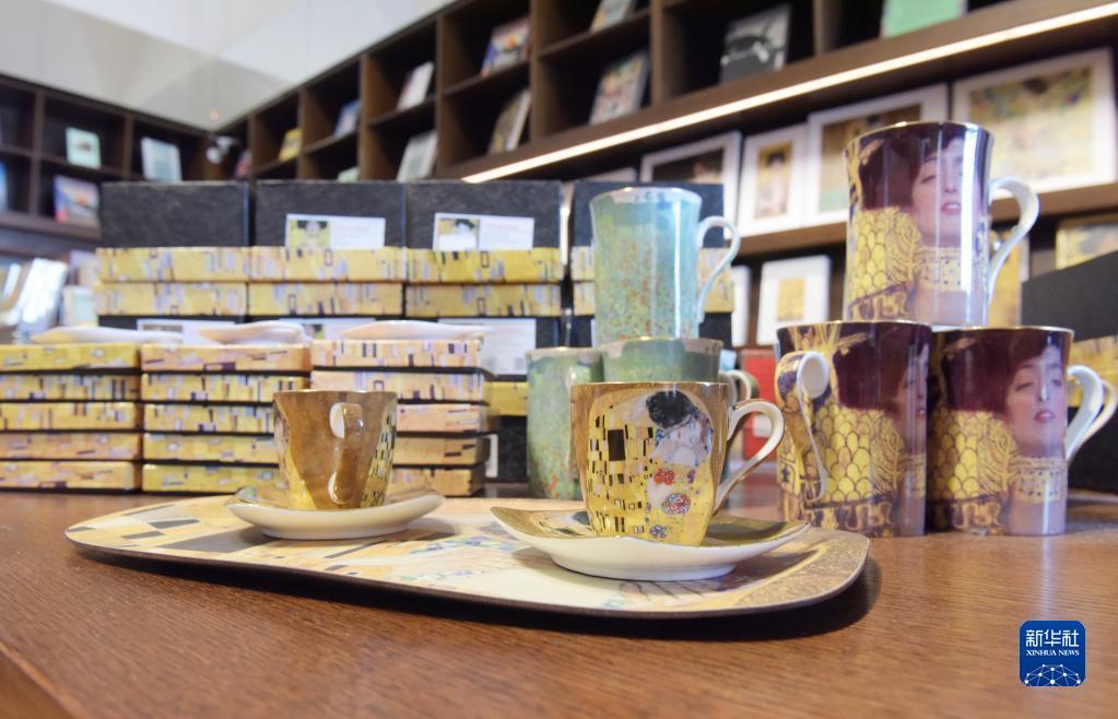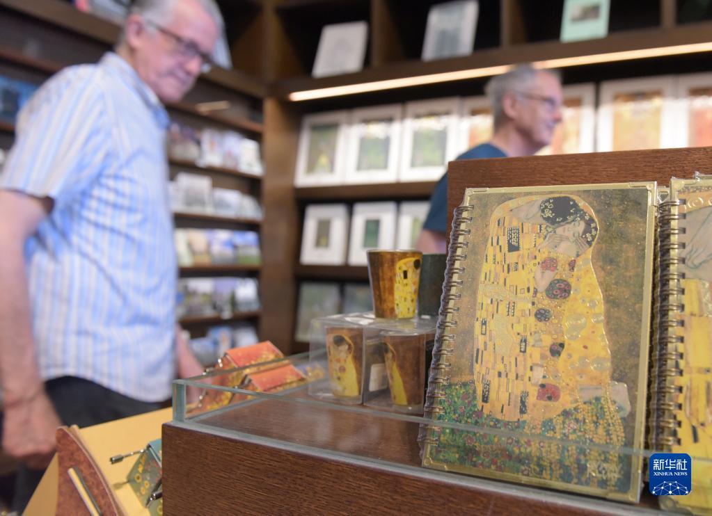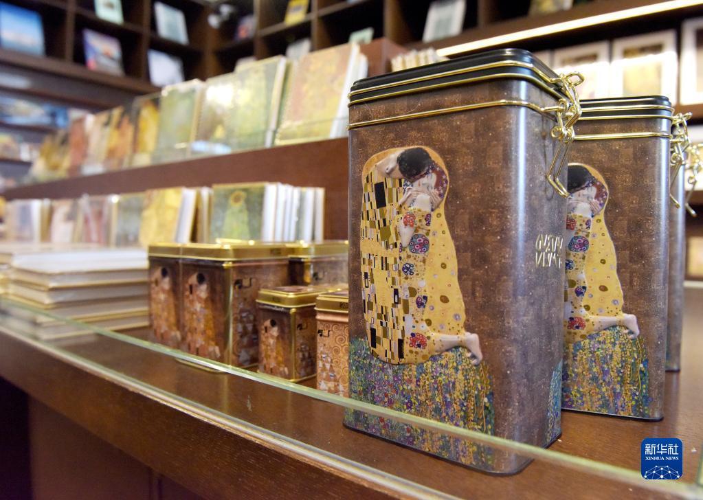 5月12日,游客在奥地利维也纳美景宫博物馆纪念品商店选购与《吻》相关的文创产品。