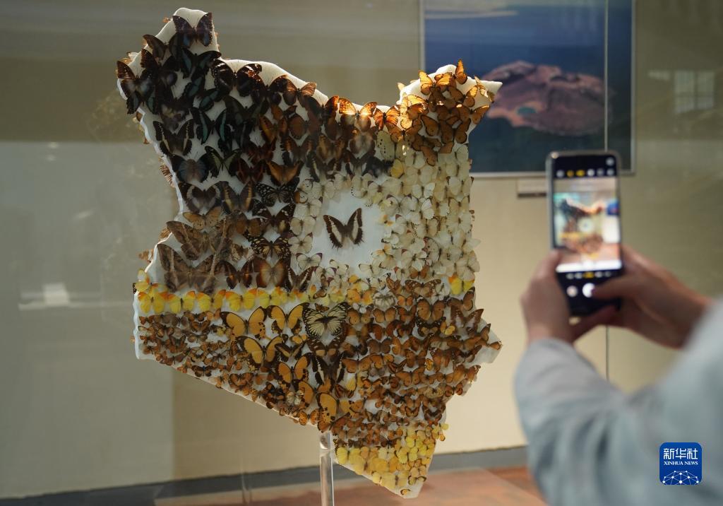 这是2022年3月17日在内罗毕国家博物馆拍摄的由肯尼亚各地蝴蝶标本组成的肯尼亚地图。肯尼亚蝴蝶种类丰富,目前已发现900多种蝴蝶。