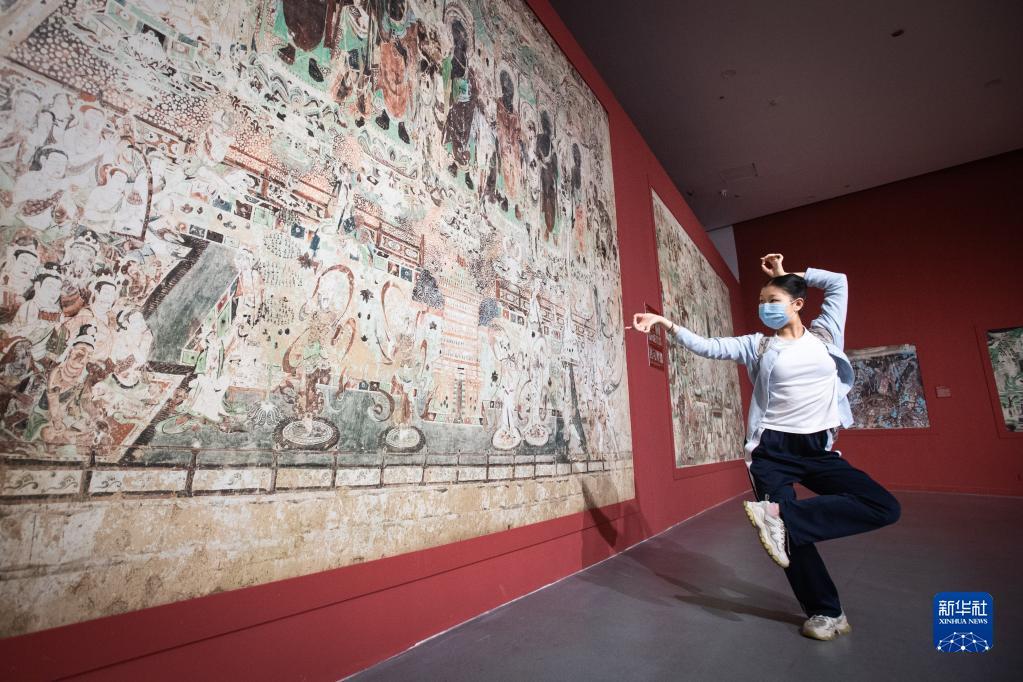 5月18日,武汉大学当代舞团学生在展览现场模仿壁画里的舞蹈动作。