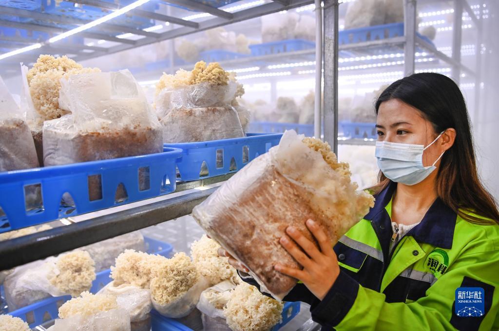商州区润科绣球菌工厂化生产项目的员工在出菇车间检查绣球菌生长情况(5月17日摄)。该项目提供就业岗位500余个,带动周边群众增收。