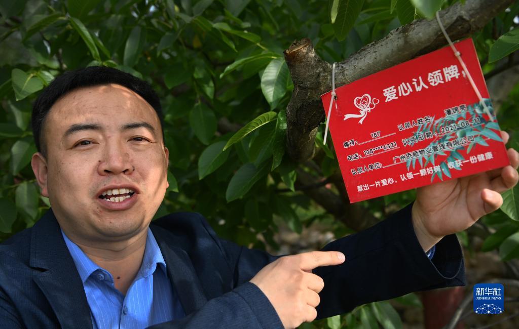 5月18日,中国邮政驻商州区陈塬街道上河村第一书记王东升在向游客介绍核桃园“爱心认领”情况。