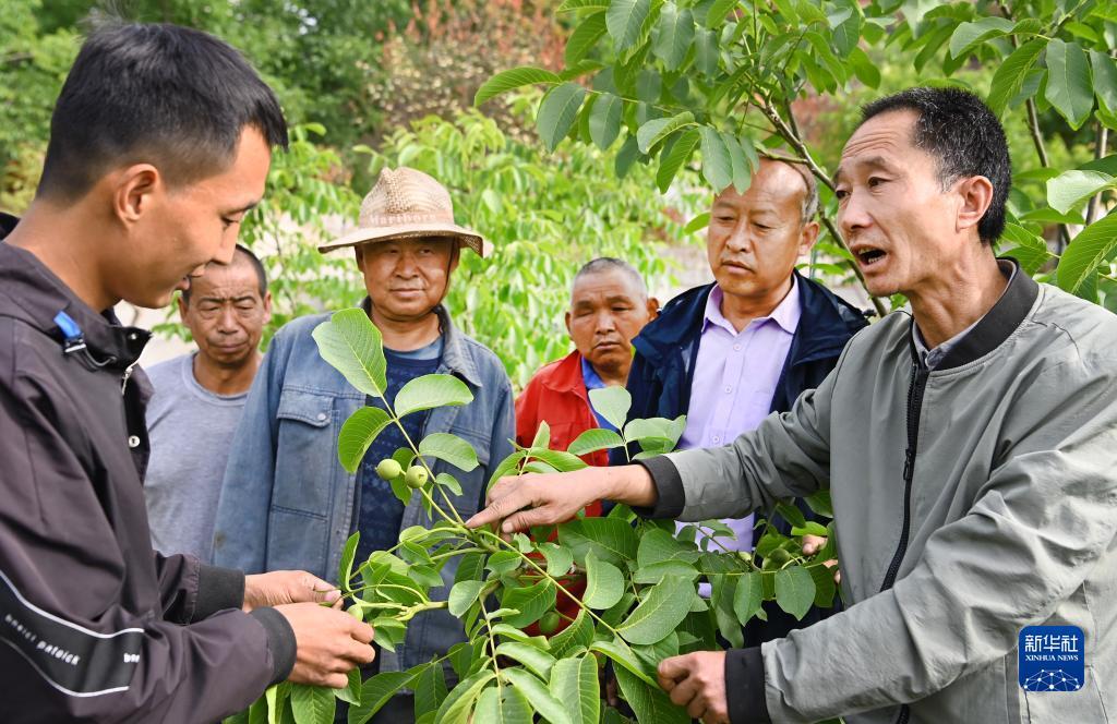 5月18日,商州区陈塬街道上河村的“国家林草乡土专家”王锋(右一)在为村民普及核桃整形修剪技巧。
