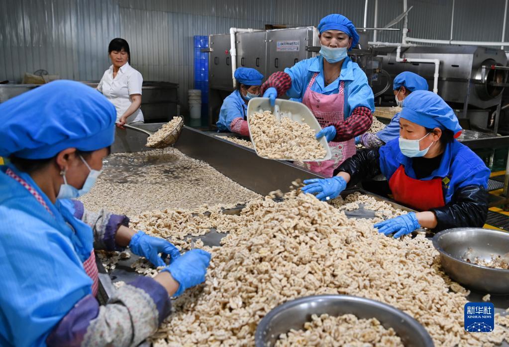 商州区的陕西供销兴茂科技有限公司的员工在手工加工核桃产品(5月17日摄)。该公司立足本地区位和农产品资源优势,让350余名村民实现在家门口就业。