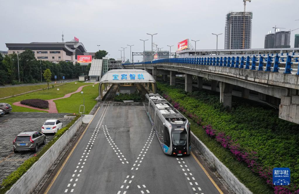 5月20日,一辆智轨电车驶入智轨电车T1运营线成贵高铁宜宾西站。