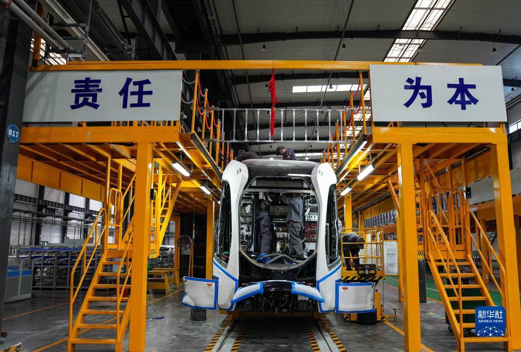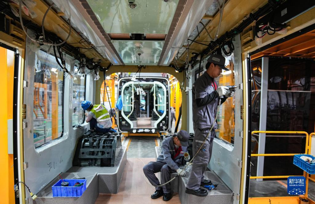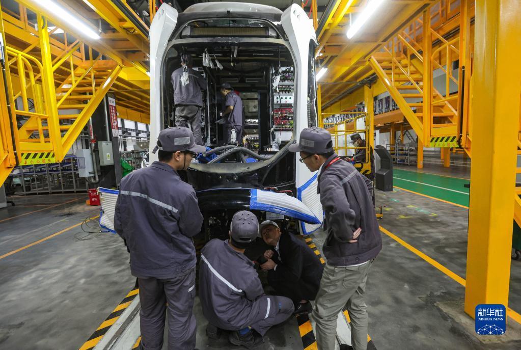 5月20日,四川省中车铁投轨道交通有限公司的工人在生产组装智轨电车。