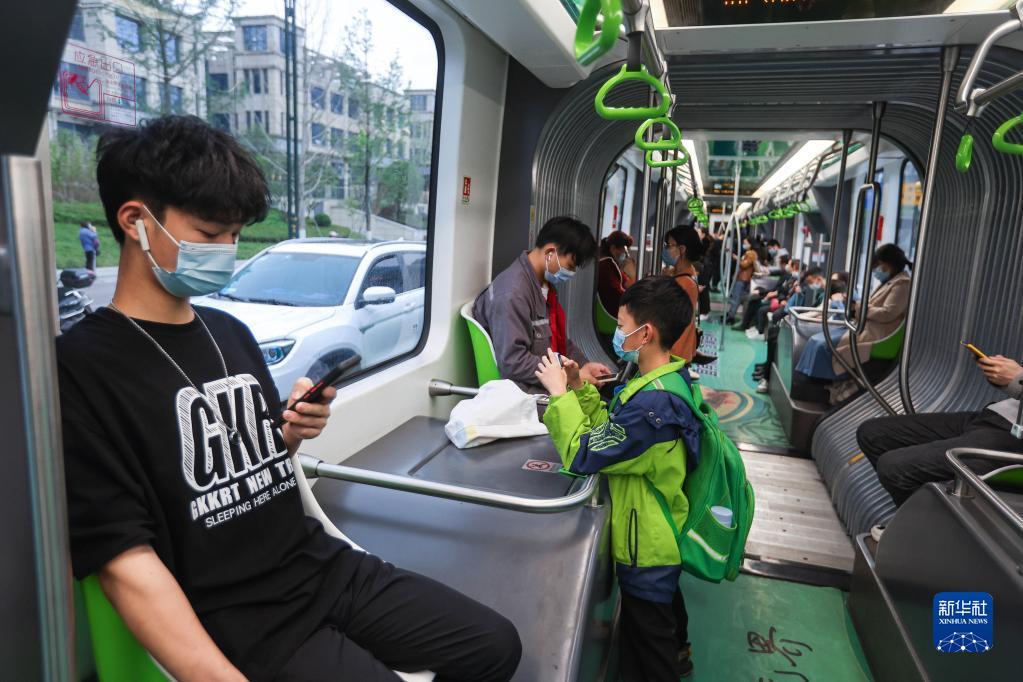 5月20日,市民乘坐一辆行驶在宜宾市T1运营线上的智轨电车。