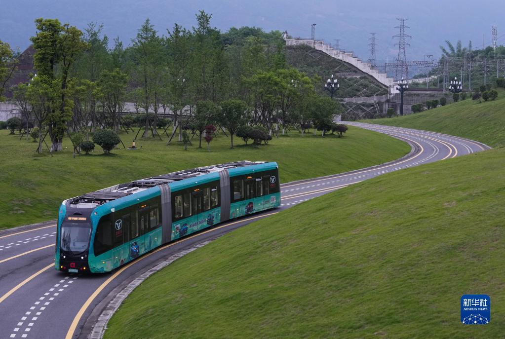 5月20日,一辆智轨电车行驶在宜宾市T1运营线上。