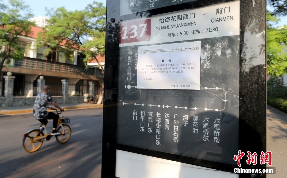 5月21日,北京丰台区一公交车站张贴停驶公告。根据北京市疫情防控要求,自5月21日首班车起,除北京西站、北京南站的公交、地铁、出租车正常运营外,其他区域公交线路全部甩站或停运,地铁站点全部封站,出租车限制区域运营。 中新社记者 张宇 摄