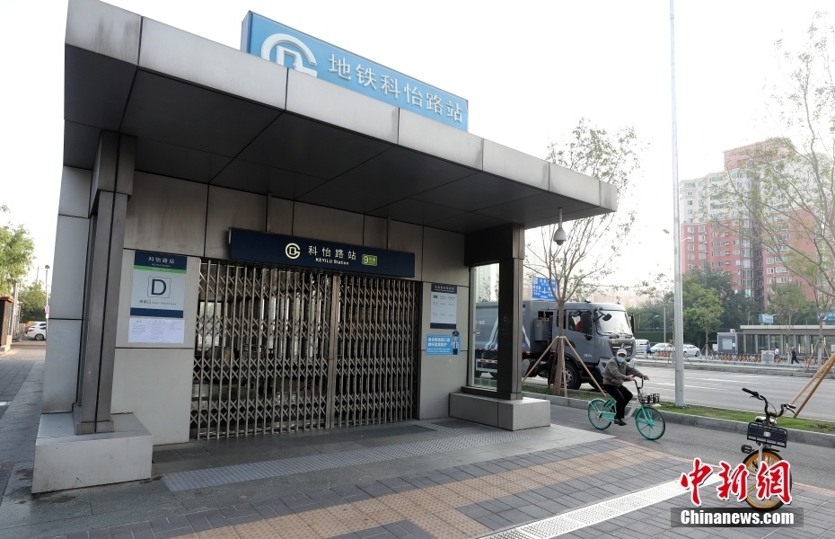 5月21日,北京丰台区地铁9号线科怡路站封站。根据北京市疫情防控要求,自5月21日首班车起,除北京西站、北京南站的公交、地铁、出租车正常运营外,其他区域公交线路全部甩站或停运,地铁站点全部封站,出租车限制区域运营。 中新社记者 张宇 摄