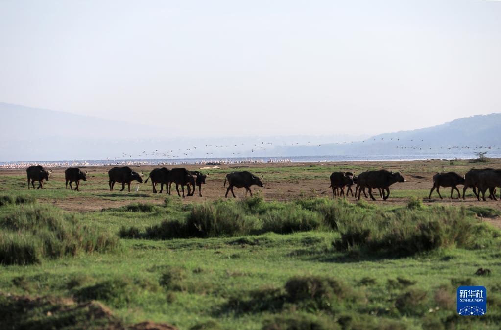 这是5月13日在肯尼亚纳库鲁湖国家公园拍摄的水牛、火烈鸟和鹈鹕。