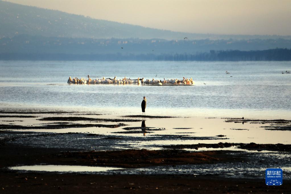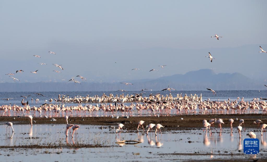 这是5月13日在肯尼亚纳库鲁湖国家公园拍摄的火烈鸟和鹈鹕。