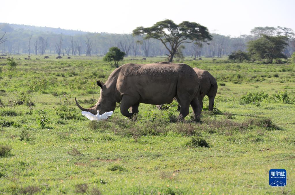 这是5月13日在肯尼亚纳库鲁湖国家公园拍摄的白犀牛。