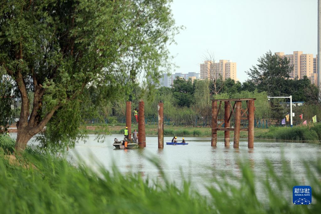 5月24日,工作人员在沧州市区段大运河河道内施工修建桥梁。