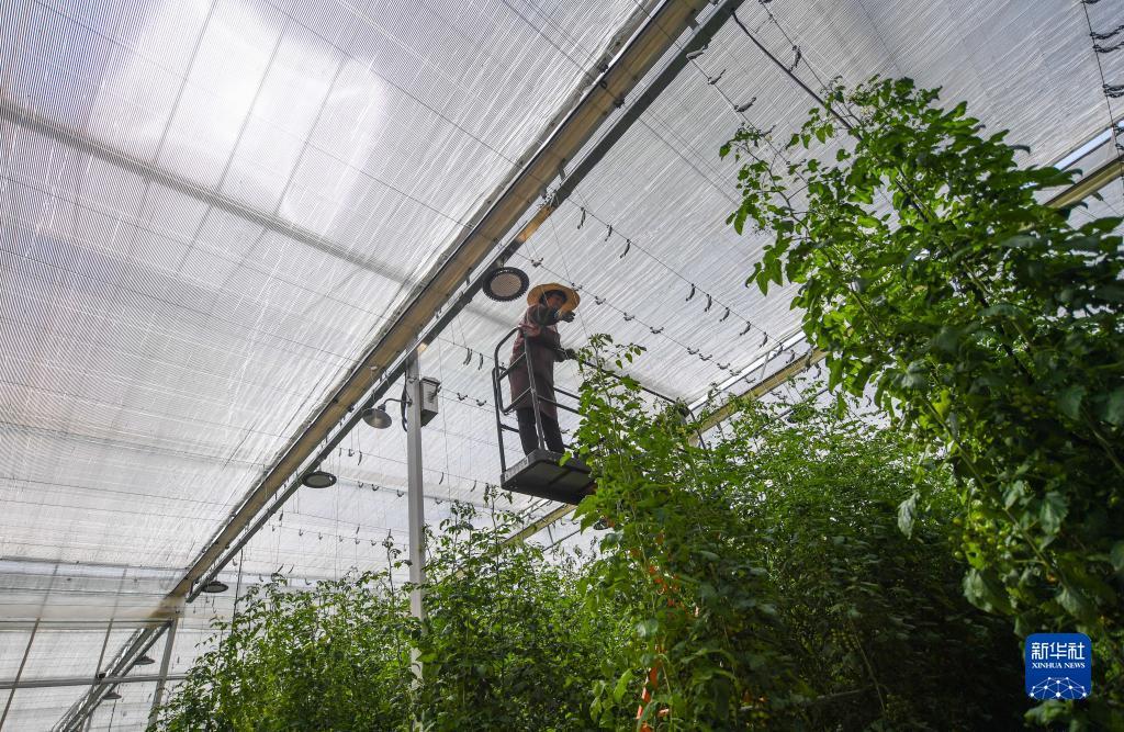 5月31日,在嘉兴市南湖区七星街道湘家荡农业数字化工厂的数字化大棚内,农民在登高车上进行疏果。