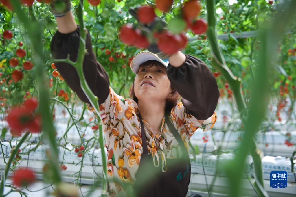 5月31日,在嘉兴市南湖区七星街道湘家荡农业数字化工厂的数字化大棚内,农民在采摘立体栽培的番茄。