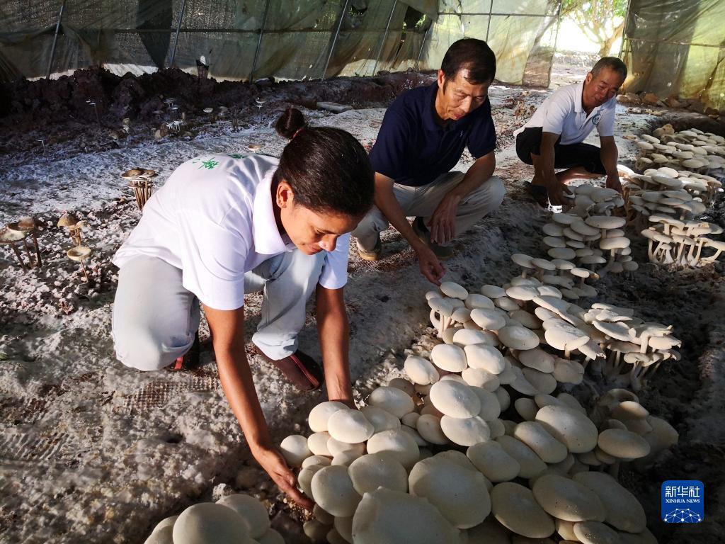 2018年6月12日,在斐济楠迪,中国专家和当地雇员检查菌菇生长情况。在中国治理荒漠化已见成效的“利器”——菌草,在斐济落地生根,助力当地发展。