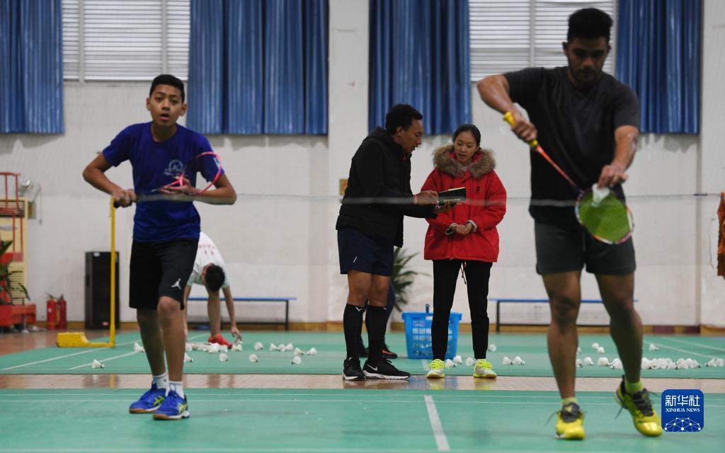 2018年12月4日,汤加羽毛球集训队领队西奥西法·马洛洛(左二)和益阳市羽毛球运动学校教练陈弈(右二)交流。在中国援汤加体育技术援助项目的推动下,近年来汤加多个运动项目集训队来华训练。