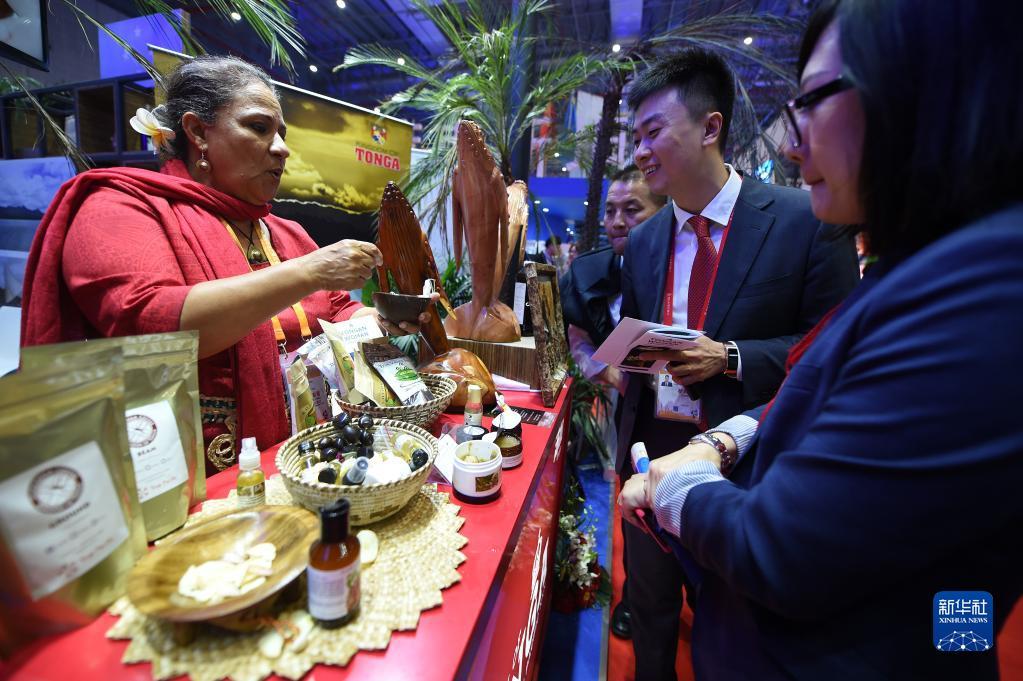2018年11月6日,在首届中国国际进口博览会上,太平洋岛国展区汤加展台的工作人员(左)向参观者介绍展出的食品。