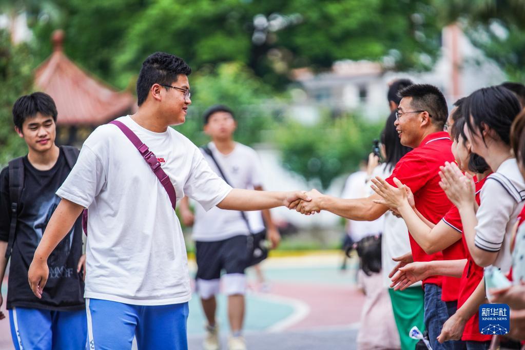 6月8日,考生(左二)在贵阳市乌当中学考点外和老师握手。
