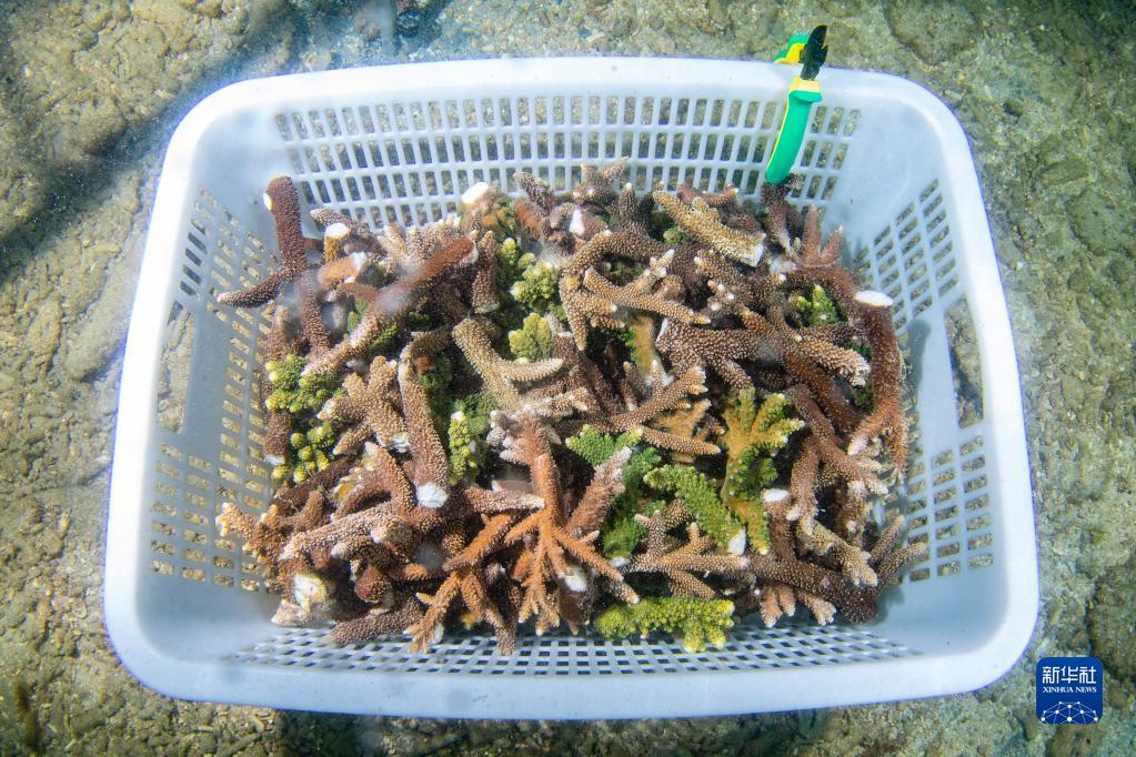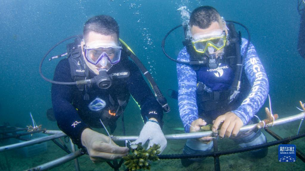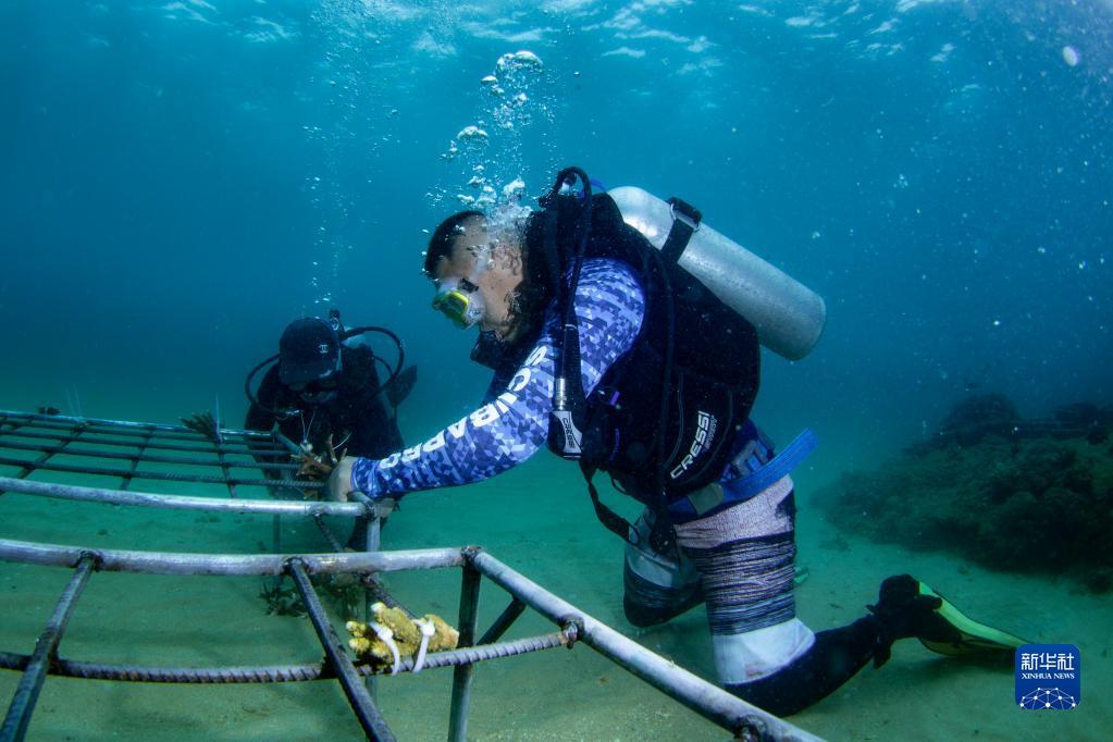 6月8日是世界海洋日,在海南省陵水黎族自治县分界洲岛附近海域,分界洲岛旅游区工作人员和海南省海洋与渔业科学院专家在海底移植珊瑚。近年来,他们一直在这里的海底“植树造林”,努力保护该海域的珊瑚礁生态系统。