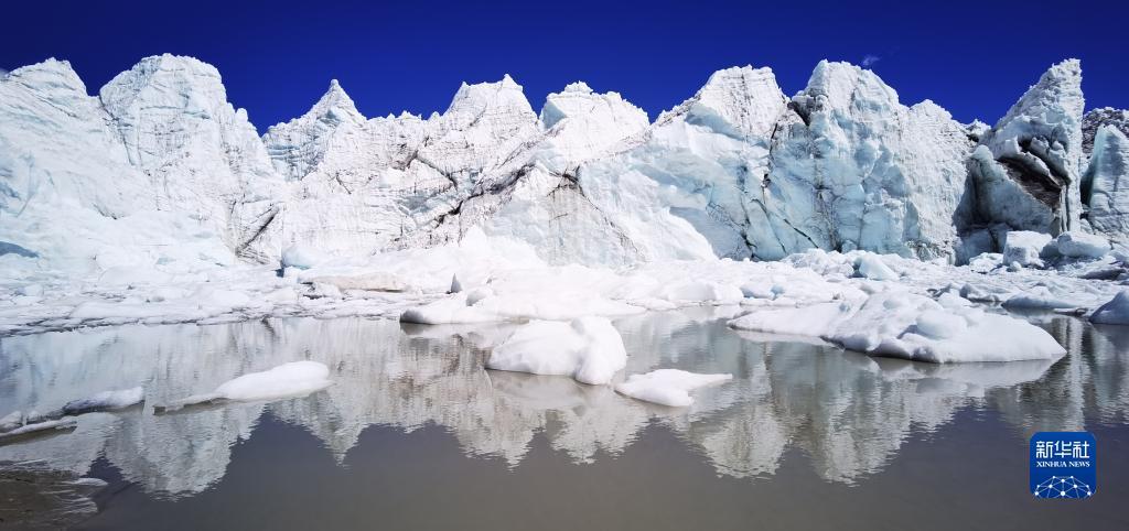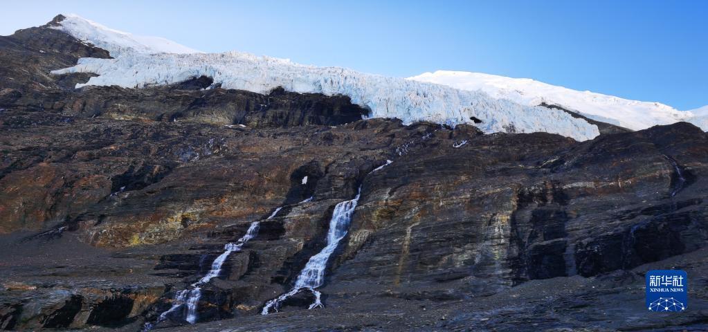 这是位于山南市浪卡子县的措嘉冰川,冰川融水形成河流(6月4日摄,无人机照片)。
