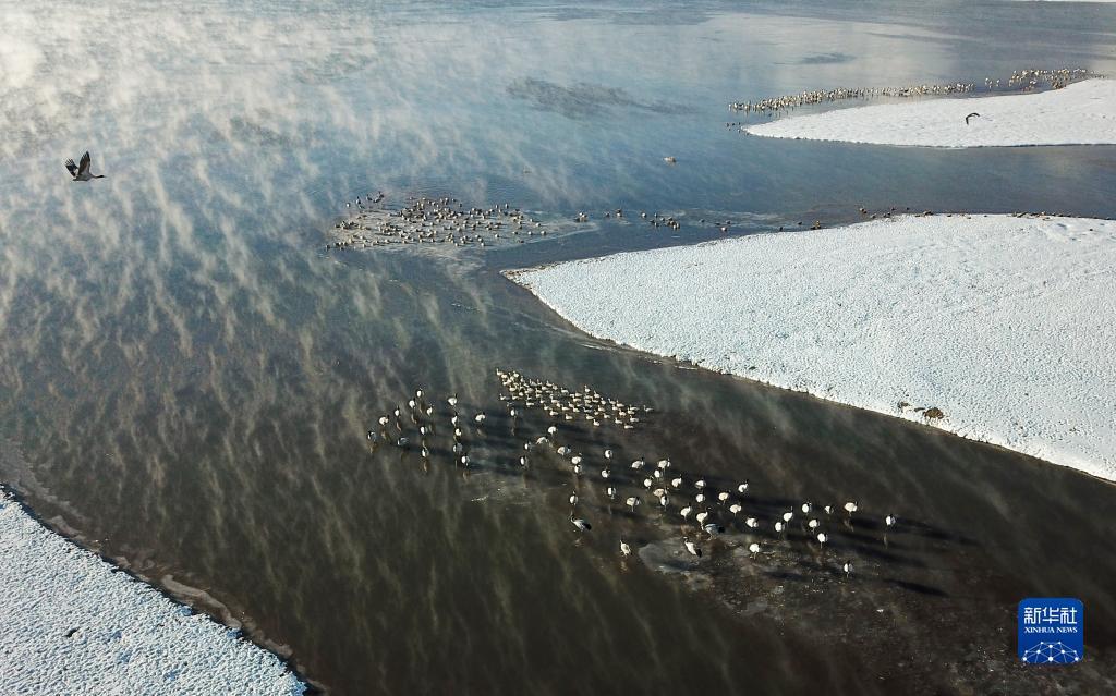 这是在拉萨市林周县虎头山水库拍摄到的黑颈鹤(2月22日摄,无人机照片)。