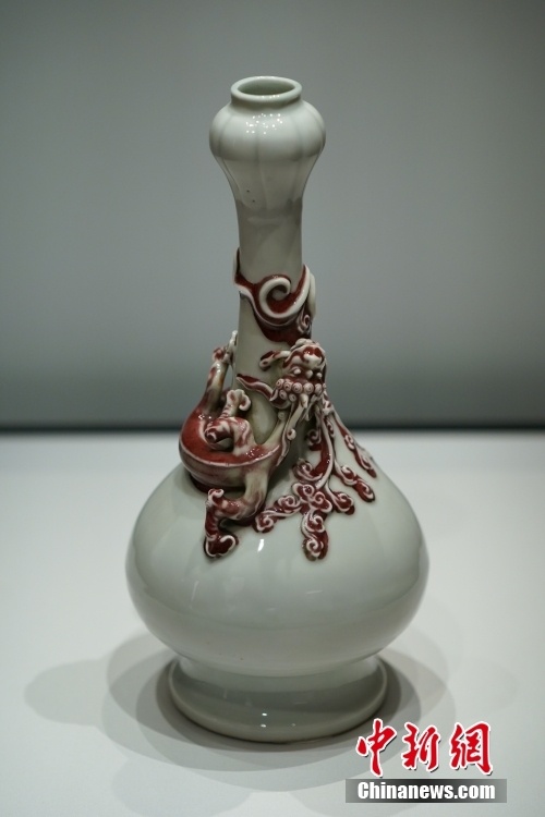 6月9日,香港,记者探访位于西九文化区的香港故宫文化博物馆。据悉,来自北京故宫博物院的914件珍贵文物,将于7月在香港故宫文化博物馆开幕展中亮相。图为国家一级文物明白釉塑贴鲜红蟠螭蒜头瓶。 中新社记者 崔楠 摄