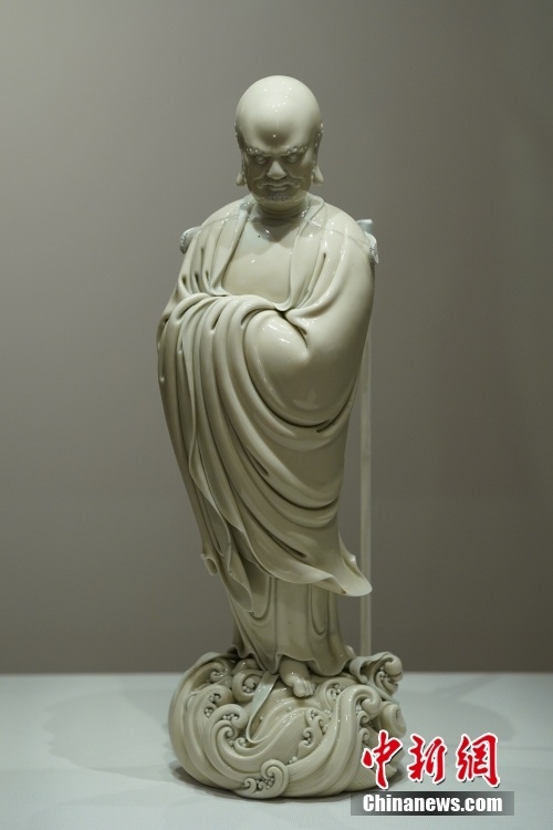 6月9日,香港,记者探访位于西九文化区的香港故宫文化博物馆。据悉,来自北京故宫博物院的914件珍贵文物,将于7月在香港故宫文化博物馆开幕展中亮相。图为国家一级文物明德化窑白釉达摩立像。 中新社记者 崔楠 摄