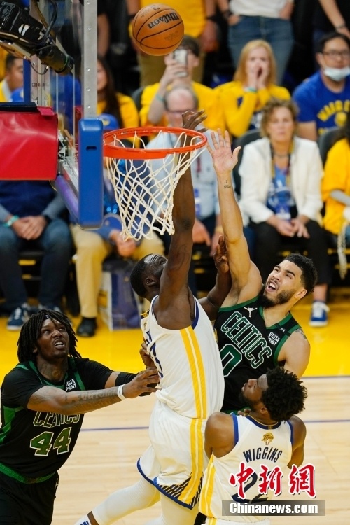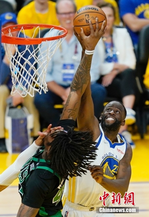 当地时间6月13日,勇士队球员格林(右)在比赛中拼抢。2021-2022赛季美职篮总决赛第5场比赛当日在旧金山大通中心进行,金州勇士队主场104:94战胜波士顿凯尔特人队,总比分3:2拿到系列赛赛点。 中新社记者 刘关关 摄