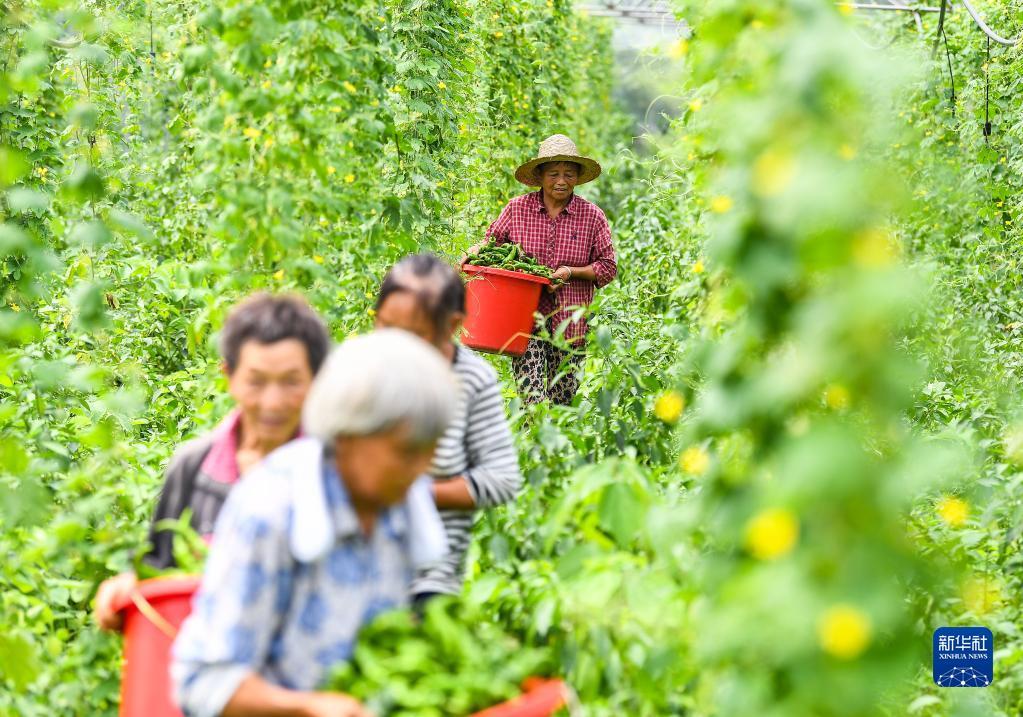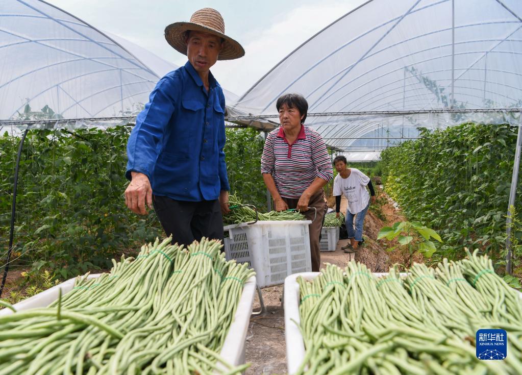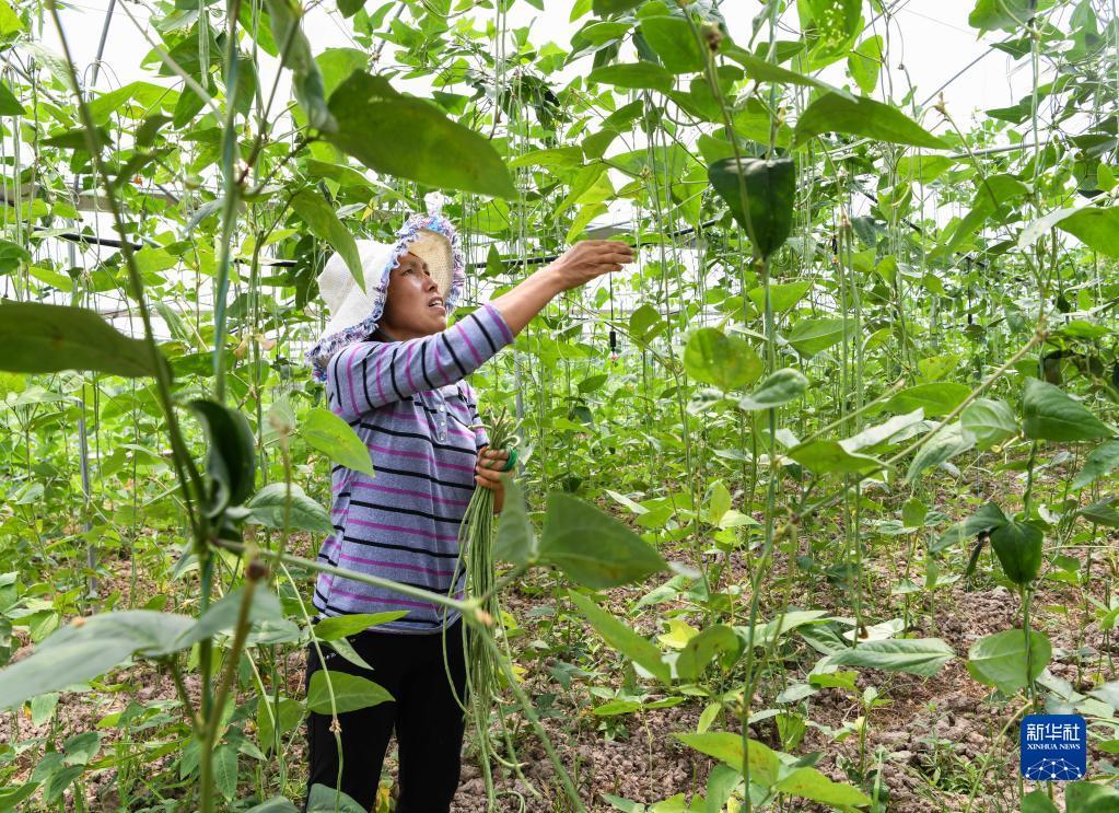 6月16日,在四川省达州市达川区双庙镇,当地农民在采摘豇豆。