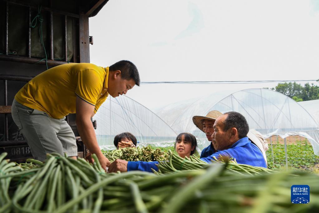 6月16日,在四川省达州市达川区双庙镇,蔬菜商将采摘的豇豆装车转运。