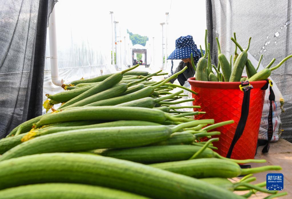 6月16日,在四川省达州市达川区双庙镇,当地农民将采摘的丝瓜装袋。