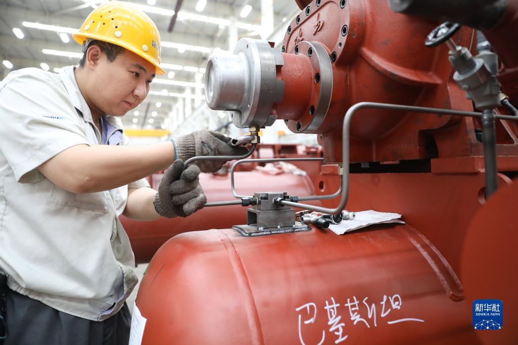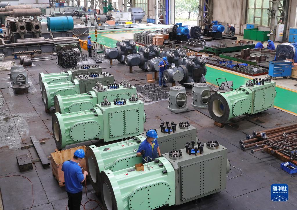 6月13日,在沈鼓集团,工人在总装车间工作。