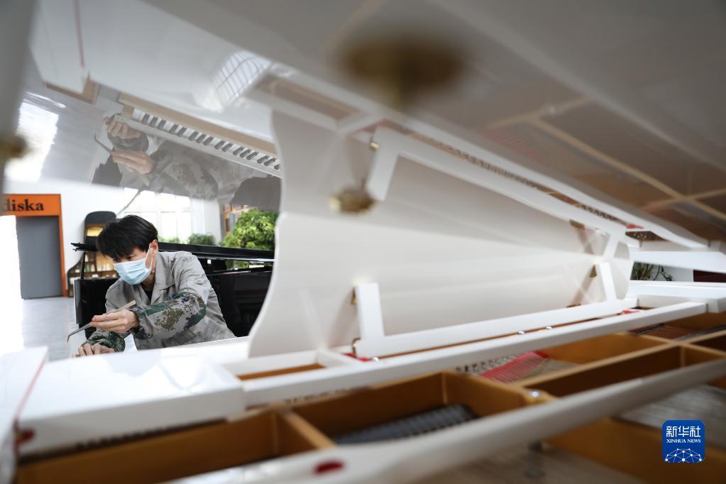 4月25日,一名工人在东北钢琴乐器有限公司车间内组装调校钢琴组件。