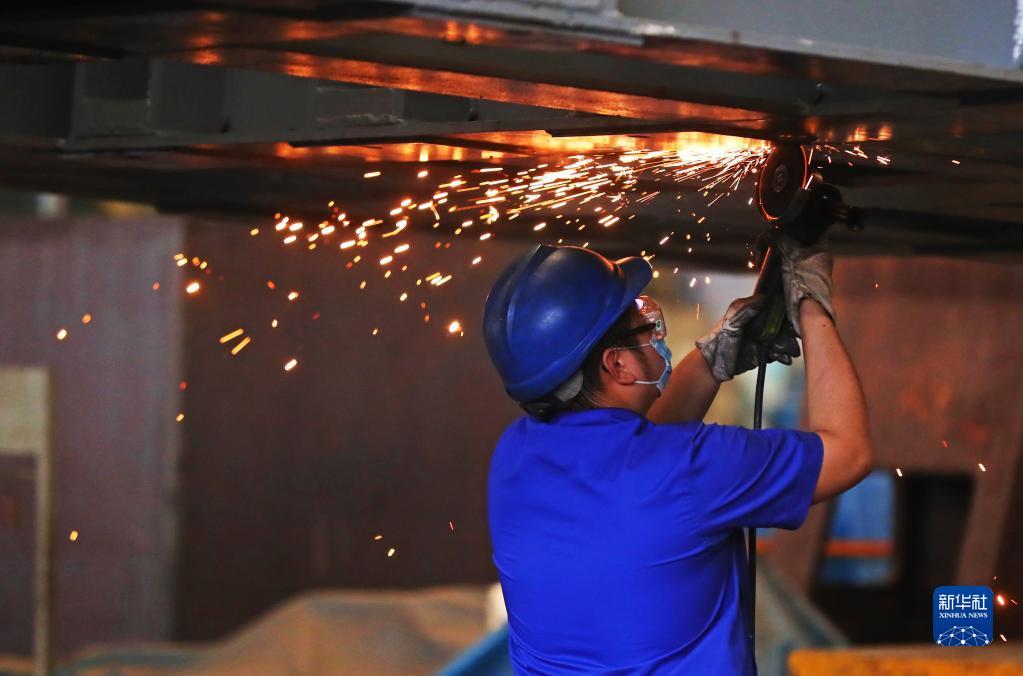 6月13日,在沈鼓集团,工人在定子车间打磨压缩机外壳。