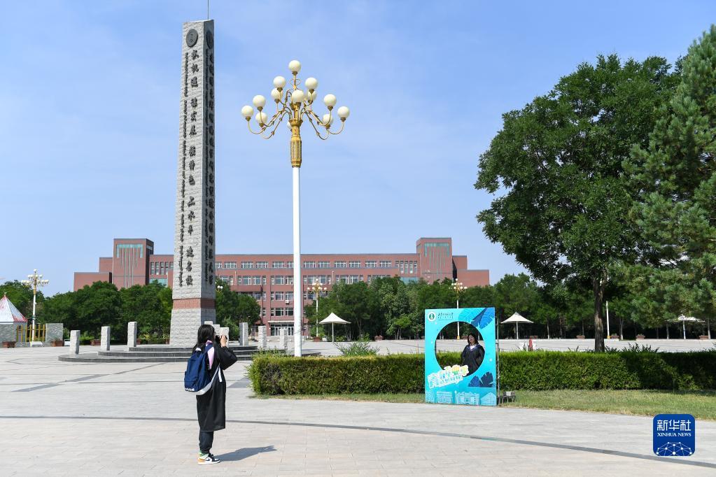 6月19日,两名应届毕业生在位于内蒙古呼和浩特市和林格尔县的内蒙古师范大学(盛乐校区)校园内合影。