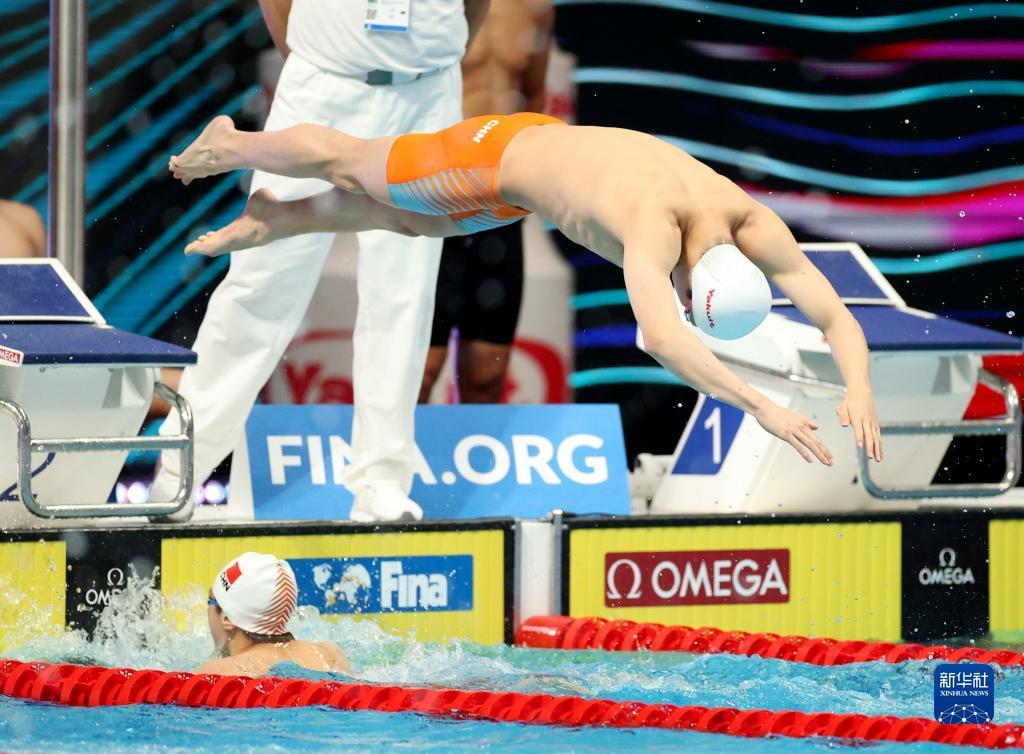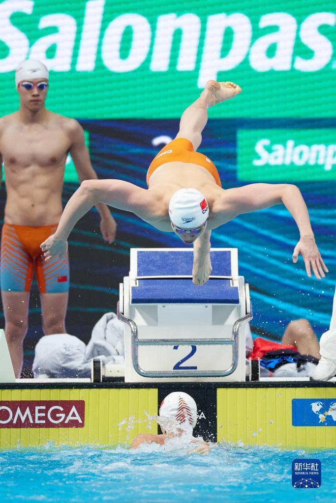 6月23日,中国队第一棒选手洪金权在比赛中入水。