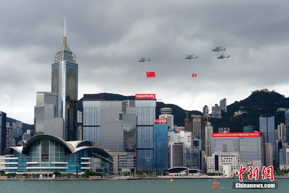 7月1日早晨,香港特区政府庆祝香港回归祖国25周年升旗仪式在金紫荆广场举行,分别悬挂五星红旗和香港区旗的直升机编队飞过维港上空。 中新社记者 张炜 摄