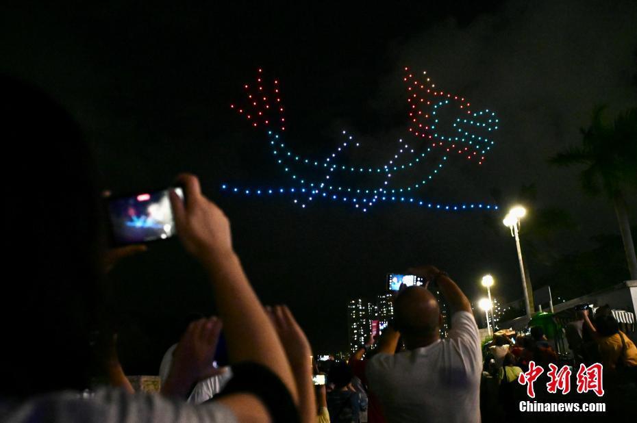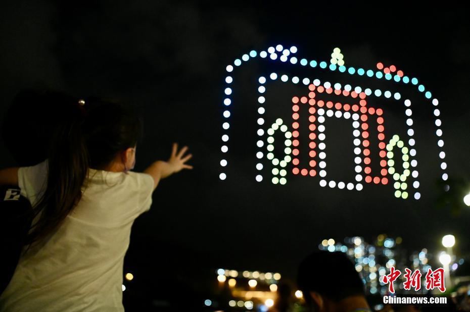 7月3日晚上,为庆祝香港回归25周年,香港大埔区以大埔传统文化及地区特色为主题,在大埔海滨公园回归塔附近,举行海、陆、空汇演,以200架无人机表演、25艘林村河彩灯船巡游及回归塔灯饰共贺香港回归祖国25周年。图为女孩伸手与无人机群互动。 中新社记者 李志华 摄