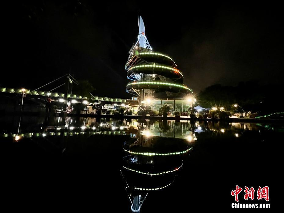 7月3日晚上,为庆祝香港回归25周年,香港大埔区以大埔传统文化及地区特色为主题,在大埔海滨公园回归塔附近,举行海、陆、空汇演,以200架无人机表演、25艘林村河彩灯船巡游及回归塔灯饰共贺香港回归祖国25周年。图为大埔回归塔亮起的灯饰。 中新社记者 李志华 摄